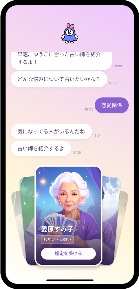 多くの占いアプリは"一度きりの診断"で終わりますが、うらっちは違います。本格的な鑑定で関係性の本質を見抜いたうえで「継続的なアドバイス」を行います。占いで得た気づきを、その後の行動につなげられる点が大きな特徴です。